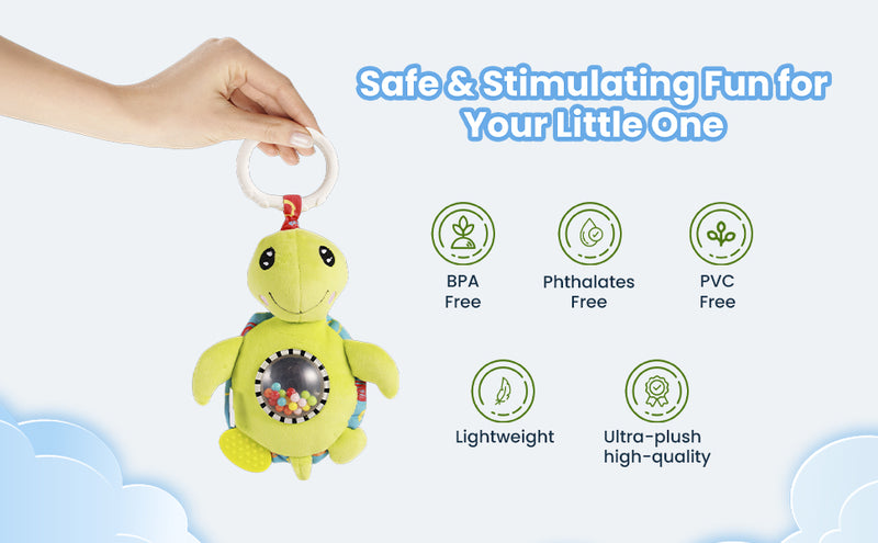 The Tortoise’s right leg doubles up as a teether, helpful in a smooth teething experience.With a rattle in its belly, this cute Tortoise enhances the baby’s play experiences.