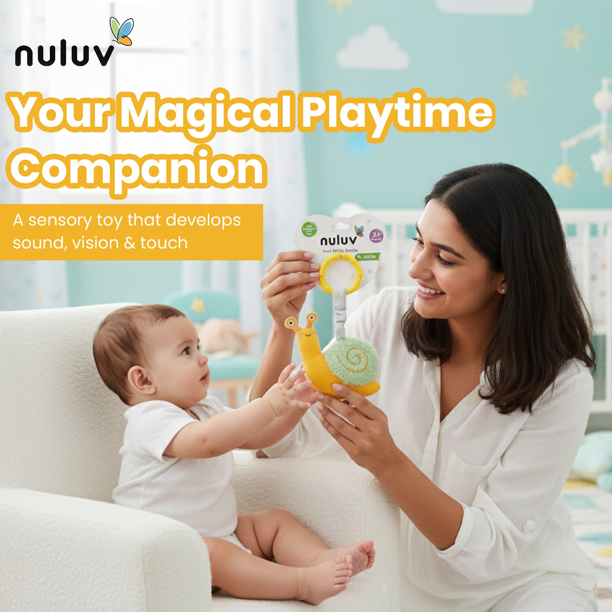 FUN RATTLE SOUND The snail toy has a built-in rattle that produces a cheerful sound when shaken, stimulating your baby’s hearing and keeping them engaged.